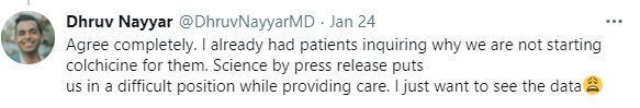 The problem comes from the fact that we do not know why the experiments were terminated early, mostly likely because they met a statistical endpoint. They didn't discuss adverse effects (which are an issue with colchicine, as the digestive epithelium is affected leading to diarrhea, etc.), confidence intervals, and the results from PCR positives versus others.